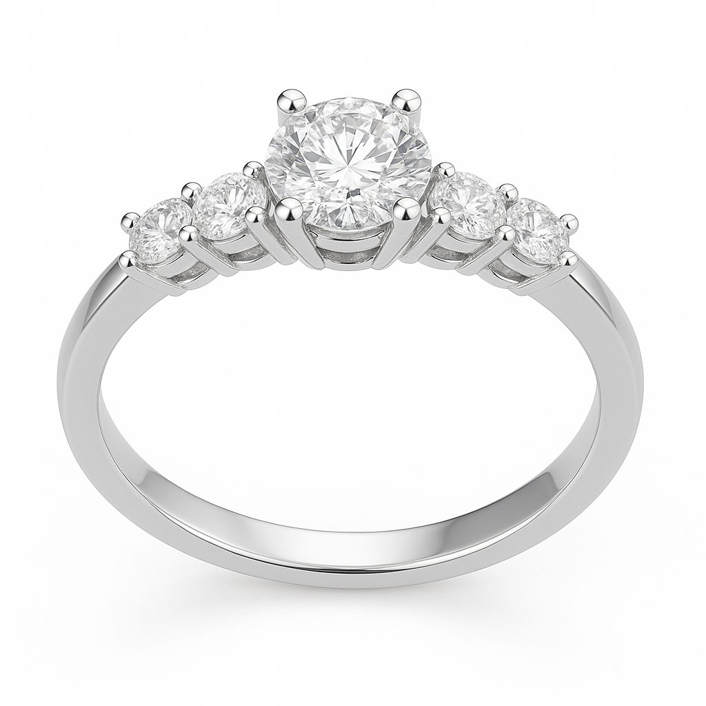 Bague solitaire accompagnée, en or argent 925 millièmes (±3.5 g), sertie de zirconias d'excellente qualité.