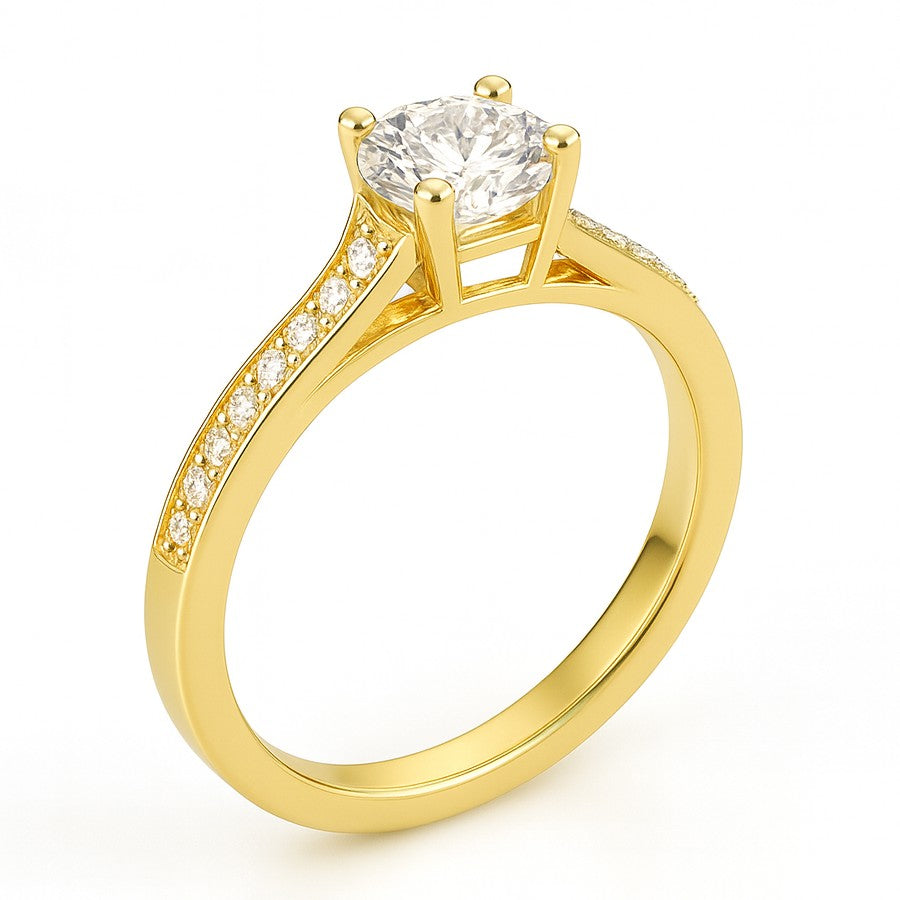 Bague de fiançailles solitaire accompagné, en or jaune 18 carats (± 5,7 g), sertie d'un zirconia d'excellente qualité.