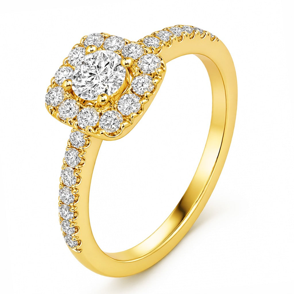 Bague solitaire accompagné, en or jaune 18 carats (± 5 g), sertie de zirconias d'excellente qualité .